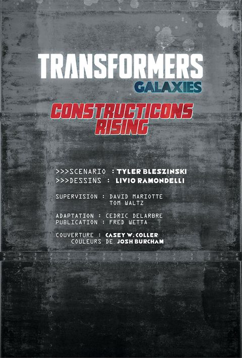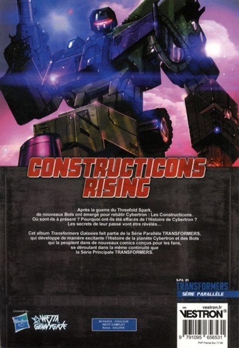 Après la guerre du Threefold Spark, de nouveaux Bots ont émergé pour rebâtir Cybertron : Les Constructicons. Où sont-ils à présentA ? Pourquoi ont-ils été effacés de l'Histoire de CybertronA ? Les secrets de leur passé vont être révélés... Avec la série parallèle 'Transformers Galaxies', Vestron approfondit l'univers de Transformers en développant de manière excitante l'Histoire de Cybertron et des Bots qui la peuplent dans de nouveaux comics conçus pour les fans, se déroulant dans la même continuité que la série principale 'Transformers'.