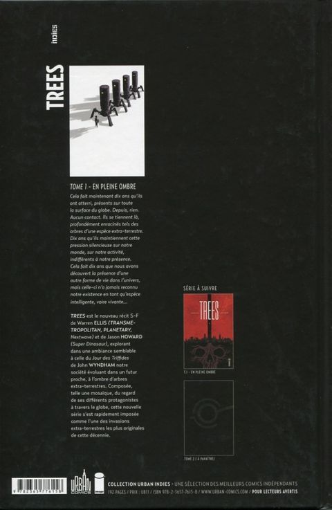 Très bon premier volume que ce Trees signé Warren Ellis. J'adore ces séries indépendantes que nous offre Urban Comics. Et, une fois de plus, je n'ai pas été déçu à la lecture de celle-ci. Des dessins très réussis et un scénario prenant comme Ellis nous offre souvent.