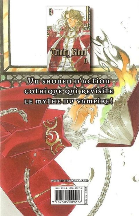 Trinity Blood Tome 11 Scénariste: Sunao Yoshida Déssinateur: Kiyo Kyujyô Date de parution : 20 août 2010 Format : 11.5x17.5 Nombre de pages : 176 Prix : 6.25 - 11.7 FCH ISBN : 9782505009276 Résumé En cours...