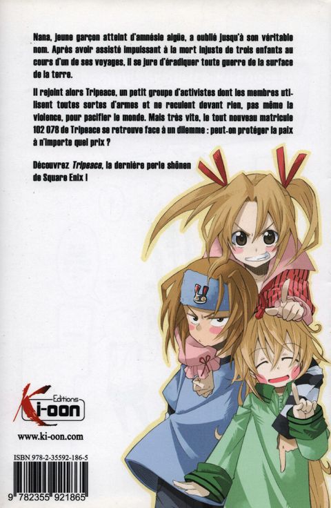 Nana, jeune garçon atteint d'amnésie algue, a oublié jusqu'à son véritable nom. Après avoir assisté Impuissant à la mort Injuste de trois enfants au cours d'un de ses voyages, il se jure d'éradiquer toute guerre de la surface do la terre. Il rejoint alors Tripeace, un petit groupe d'activistes dont les membres utilisent toutes sortes d'armes et ne reculent devant rien, pas même la violence, peur pacifier le monde. Mais très vite, le tout nouveau matricule 102 078 de Tripeace se retrouve face à un dilemme : peut-on protéger la paix à n'importe quel prix ? Découvrez Tripeace, la dernière perle shônen de Square Enix!