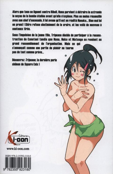 Alors que tous se liguent contra Riboll, Nana parvient à détruire In extremis le noyau de la bombe étoilée avant qu'elle n'explose. Plus ou moins réconcilié avec son chef d'escouade. Il lui avoue qu'il est en réalité Nanako... Bien mal lui en prend ! Miro refuse obstinément de le croire, et les voilà de nouveau à couteaux tirés. Sous l'Impulsion de la Jeune fille. Tripeace décide de participer à la reconstruction de Canetool tandis que Nana. Nuko et Matsuge se rendent au grand rassemblement de l'organisation. Mais ce qui s'annonçait comme une partie de plaisir ne tourne pas du tout comme prévu... Découvrez Tripeace la dernière perle shônen de Square Enix !