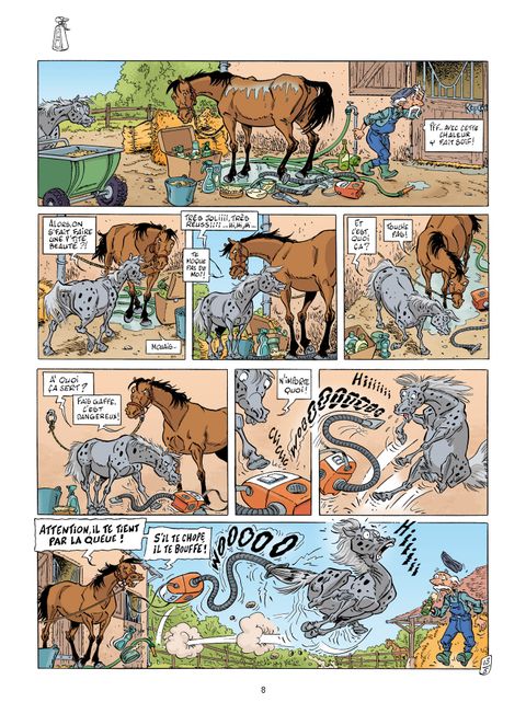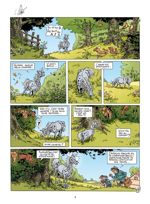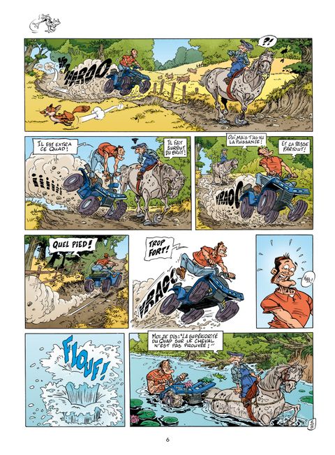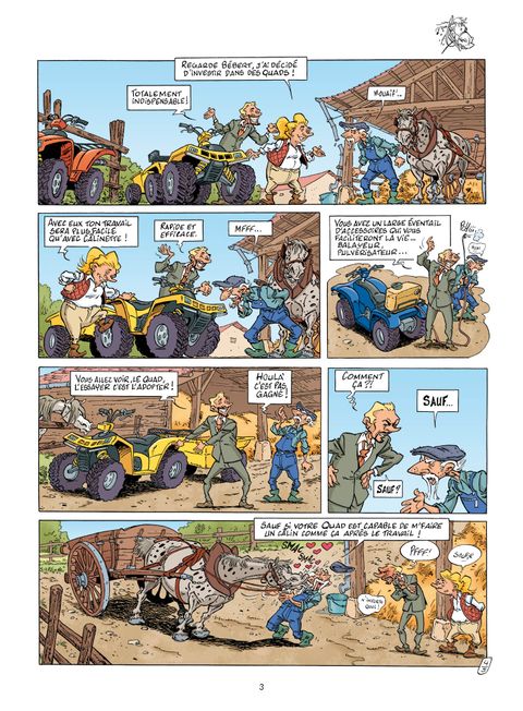 Par le biais du quad, le moteur à explosion fera-t-il son entrée au club hippique ? La directrice croit dur comme fer que ces motos à quatre roues sont rapides et sûres. Roméo, le bellâtre écervelé, s'amuse comme un fou à chevaucher ces engins. Cependant, le vieux Bébert ne jure que par les canassons. À l'aide de Calinette, sa paisible percheronne, le palefrenier chafouin se fait fort de montrer à tous qu'aucune mécanique ne sera supérieure à la puissance animale. La communauté chevaline n'en pense pas moins. Dès que les hommes ont le dos tourné, les chevaux s'expriment enfin par le verbe. Des brèves de prairies à bride abattue !