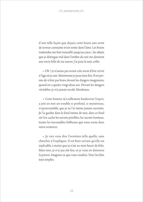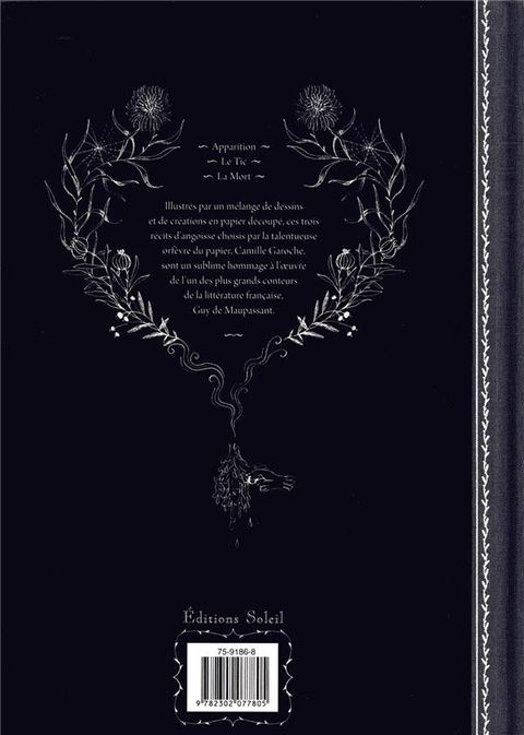 Trois contes de fantômes propose trois nouvelles fantastiques écrites par Guy de Maupassant, choisies et illustrées par Camille Garoche, véritable orfèvre du papier découpé. Apparition s'intéresse à une histoire étrange survenue au marquis de la Tour-Samuel, alors qu'il était âgé d'une vingtaine d'années, et qui le hante depuis... Le Tic est le récit d'un père, affligé d'un tic singulier, qui raconte les mystérieuses raisons qui incitent sa fille à porter un gant à la main gauche... Enfin, La Mort nous immerge dans les souvenirs du narrateur dont la femme est morte, lorsque d'étranges phénomènes se produisent...Trois contes de fantômes propose trois nouvelles fantastiques écrites par Guy de Maupassant, choisies et illustrées par Camille Garoche, véritable orfèvre du papier découpé. Apparition s'intéresse à une histoire étrange survenue au marquis de la Tour-Samuel, alors qu'il était âgé d'une vingtaine d'années, et qui le hante depuis... Le Tic est le récit d'un père, affligé d'un tic singulier, qui raconte les mystérieuses raisons qui incitent sa fille à porter un gant à la main gauche... Enfin, La Mort nous immerge dans les souvenirs du narrateur dont la femme est morte, lorsque d'étranges phénomènes se produisent...