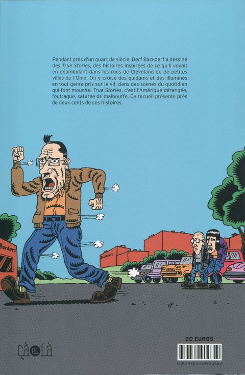 Le retour du plus connus des dessinateurs de Cleveland (après Joe Shuster), dans une anthologie de ses histoires courtes ! Derf Backderf a réalisé des strips hebdomadaires pendant près d'un quart de siècle, entre 1990 et 2014. D'abord diffusés dans les journaux gratuits de la ville de Cleveland, ces strips atteindront par la suite jusqu'à 140 journaux du pays. Voici 200 de ces histoires rassemblées pour la première fois en un unique volume. Dans True Stories, on croise des illuminés en tous genre, pris sur le vif dans la rue ou dans des magasins, des scène du quotidien qui font mouche. True Stories, c'est l'Amérique profonde, dérangée, saturée de malbouffe, foutraque. On retrouve avec bonheur la patte de cet auteur dont le dessin, en construction au début des années 1990, évolue au fil des histoires et cette faculté à déceler les situations baroques et à croquer des personnages marquants, alliée à un art consommé de la chute. « Oui, tout ce qui est dans ce livre est réellement arrivé. J'ai été personnellement témoin de la plupart de mes True Stories. Les autres m'ont été rapportées par des amis en lesquels j'ai confiance. Devoir réaliser un strip chaque semaine ne me manque pas vraiment. Ce qui me manque, c'est de me balader dans les rues de la ville à la recherche de gens bizarres. Ça a toujours été ce qui me plaisait le plus dans ce boulot » Derf Backderf.
