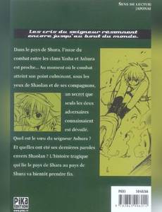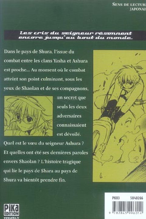 Dans le pays de shura, l'issue du combat entre les clans yasha et ashura est proche... Au moment où le combat atteint son point culminant, sous les yeux de shaolan et de ses compagnons, un secret que seuls les deux adversaires connaissaient est dévoilé. quel est le voeu du seigneur ashura ? et quelles ont été les dernières paroles envers shaolan ? l'histoire tragique qui lie le pays de shara au pays de shura va prendre fin.