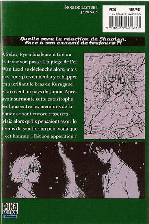 A Seles, Fye a finalement tiré un trait sur son passé. Un piège de FeiWan Lead se déclenche alors, mais nos amis parviennent à y échapper en sacrifiant le bras de Kurogané et arrivent au pays du Japon. Après avoir surmonté cette catastrophe, les liens entre les membres de la bande se sont encore resserrés ! mais alors qu'ils pensaient avoir le temps de souffler un peu, voilà que " cet homme " fait son apparition !.