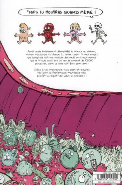 "Après avoir brillamment démystifié la science au cinéma, le Professeur Moustache s'attaque à. votre corps ! Si vous croyez que l'apoptose est une maladie des pieds ou si pour vous le «stade anal» est un lieu de concert de 100 000 personnes, alors ce livre est fait pour vous ! Méchants virus et vilaines bactéries, psychologie et scientifiques un peu cinglés : pour passer son doctorat les doigts dans le nez ou simplement pour briller en société, Tu mourras moins bête, c'est excellent pour la santé ! Grâce à son programme «cinq rires et légumes par jour», le Professeur Moustache vous promet un esprit sain dans un cornichon !"