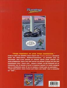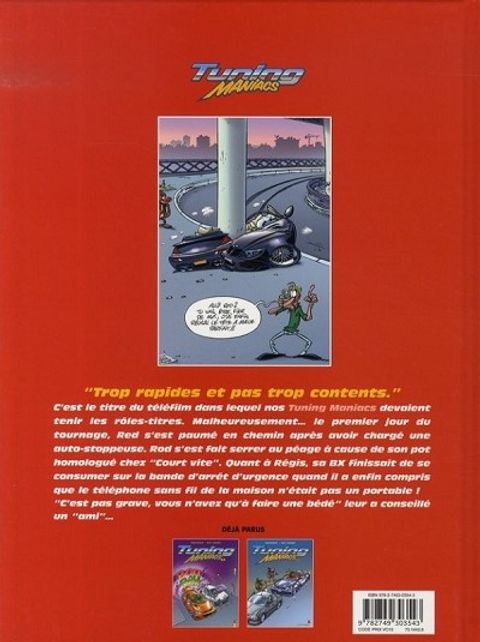 " Trop rapides et pas trop contents. " C'est le titre du téléfilm dans lequel nos Tuning Maniacs devaient tenir les rôles-titres. Malheureusement... le premier jour du tournage, Red s'est paumé en chemin après avoir chargé une auto-stoppeuse. Rod s'est fait serré au péage à cause de son pot homologué chez " Court vite ". Quant à Régis, sa BX finissait de se consumer sur la bande d'arrêt d'urgence quand il a enfin compris que le téléphone sans fil de la maison n'était pas un portable ! " C'est pas grave, vous n'avez qu'à faire une bédé " leur a conseillé un " ami "...