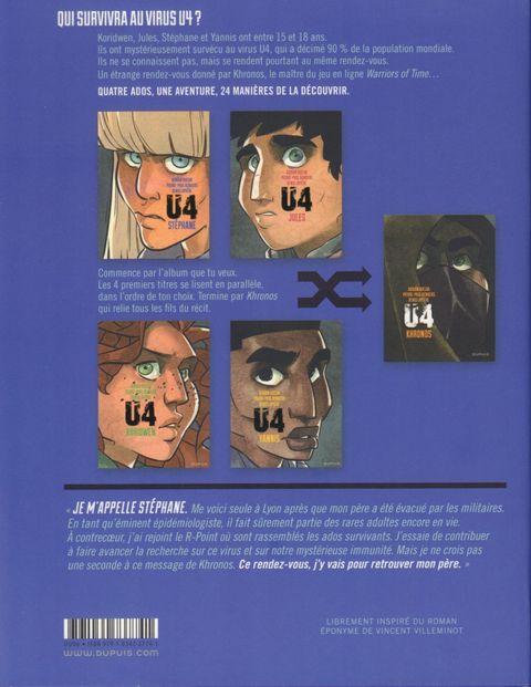 " Je m'appelle Stéphane. Ce rendez-vous, j'y vais pour retrouver mon père. " Avant le virus, Stéphane menait à Lyon la vie tranquille d'une élève bourgeoise en compagnie de son père, éminent épidémiologiste. La pandémie U4 a exterminé en dix jours toute la population, à l'exception des adolescents. Mais Stéphane a une conviction : son père a survécu, protégé par l'armée, et il cherche une solution à la pandémie. Plutôt que de rejoindre le R-Point où la majorité des jeunes s'organisent, sous la supervision des rares militaires survivants, elle préfère rester seule à l'appartement pour attendre le retour de son père... C'est un choix risqué : l'anarchie rampante progresse et plonge peu à peu Lyon dans le chaos... Stéphane ne croit pas à cet étrange rendez-vous à Paris pour les joueurs experts de Warriors of Time, mais les circonstances vont peut-être la faire changer d'avis...