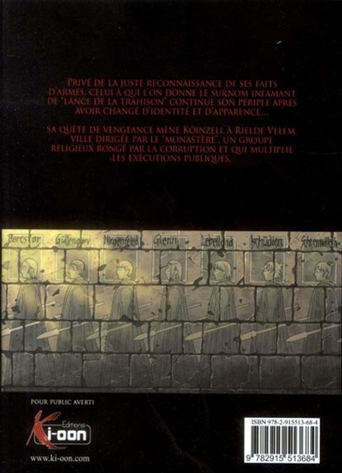Privé de la juste reconnaissance de ses faits d'armes, celui à qui l'on donne le surnom infamant de "" lance de la trahison "" continue son périple après avoir changé d'identité et d'apparence... Sa quête de vengeance mène Koïnzell à Rielde Velem, ville dirigée par le "" monastère "", un groupe religieux rongé par la corruption et qui multiplie les exécutions multiples.