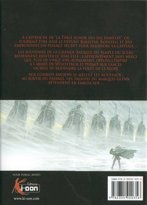 A l'approche de La Table ronde des dix familles, où pourrait être jugé le défunt Barestar, Koïzell et Ato empruntent un passage secret pour rejoindre la capitale... Les souvenirs de la Grande Bataille du temple du sceau reviennent hanter le semi-elfe: l'affrontement sans merci qui, plus de vingt ans auparavant, opposa l'Empire à l'armée de Wischtech et permit aux lances sacrées de rejoindre la forêt de la mort. Aux combats anciens se mêlent les nouveaux: au sortir au passage, les troupes du marquis Glenn attendent en embuscade...