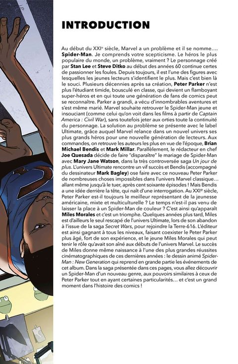Peter Parker est mort mais le monde a encore besoin de Spider-Man. C'est alors qu'un jeune adolescent du nom de Miles Morales reprend ce rôle. Cet album fait partie des must-have, des récits essentiels et accessibles destinés à tous les amateurs de super-héros. Identifiés clairement par un logo sur la couverture, les lecteurs repéreront immédiatement ces incontournables pour se constituer leur bibliothèque Marvel idéale. Cet ouvrage est la réédition du premier arc d'Ultimate Comics Spider-Man, dans lequel on découvre Miles Morales (devenu connu du grand public grâce au film d'animation oscarisé Spider-Man : New Generation). Se situant chronologiquement juste avant, il complète parfaitement l'album MARVEL OMNIBUS - La mort de Spider-Man, paru en juillet.