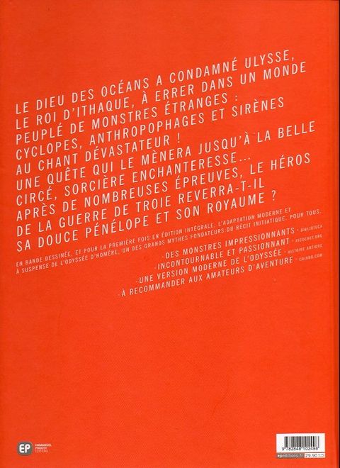 Le dieu des océans a condamné Ulysse, le roi d'Ithaque, à errer dans un monde peuplé de monstres étranges : cyclopes, anthropophages et sirènes au chant dévastateur ! Une quête qui le mènera jusqu'à la belle Circé, sorcière enchanteresse... Après de nombreuses épreuves, le héros de la guerre de Troie reverra-t-il sa douce Pénélope et son royaume ? En bande dessinée, et pour la première fois en édition intégrale, l'adaptation moderne et à suspense de l'Odyssée d'Homère, un des grands mythes fondateurs du récit initiatiques, pour tous.