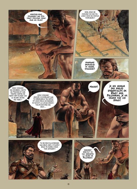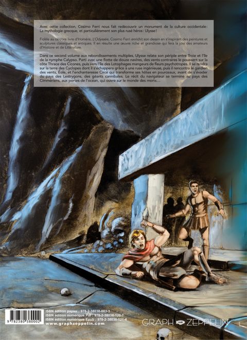 Cosimo Ferri poursuit avec talent sa relecture fidèle des grandes aventures grecques.” (la-ribambulle.com) Poursuivant son voyage dans la Grèce Antique, Cosimo Ferri entame un nouveau cycle avec Ulysse. Suivant à la lettre le célèbre livre d’Homère (L’Odyssée), l’auteur relate le retour chez lui du héros, qui, après l’épopée de la guerre de Troie, rencontrera sur les flots maintes aventures envoûtantes et périlleuses. Dans ce deuxième opus Ulysse révèle enfin son identité aux Phéaciens, et fait le récit du périple qu'il a accompli entre la chute de Troie et son arrivée sur l'île de Calypso. Il relate son départ avec une flotte de douze navires et comment les vents les ont poussés vers Ismaros, la cité des Cicones puis vers l'île des Cyclopes où ils seront faits prisonniers par Polyphème ; sa rencontre avec Éole, le gardien des vents et l'enchanteresse Circé ; comment ils ont échappés aux Lestrygons, les géants cannibales, résistés au chant mortel des Sirènes et invoqués les morts au pays des Cimmériens afin de rentrer à Ithaque. Deuxième volume d’une série légendaire de la mythologie grecque, Ulysse associe rigueur historique et talent artistique qui fera la joie des amateurs d’Histoire et de Littérature.