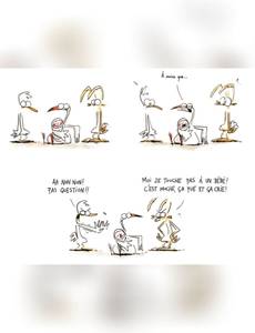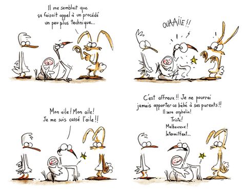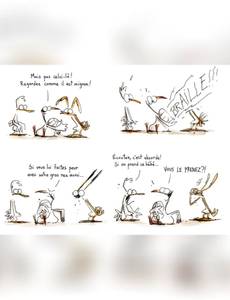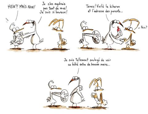 Cet album met en scène les aventures burlesques de trois animaux un peu limités intellectuellement et qui doivent remplir une mission : se rendre à Avignon pour livrer un bébé à ses parents.