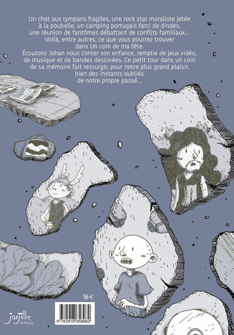 Un chat aux tympans fragiles, une rock star moraliste jetée à la poubelle, un camping portugais farci de dindes, une réunion de fantômes débattant de conflits familiaux... Voilà, entre autres, ce que vous pourrez trouver dans Un coin de ma tête. Écoutons Johan nous conter son enfance, remplie de jeux vidéo, de musique et de bandes dessinées. Ce petit tour dans un coin de sa mémoire fait ressurgir, pour notre plus grand plaisir, bien des instants oubliés de notre propre passé...