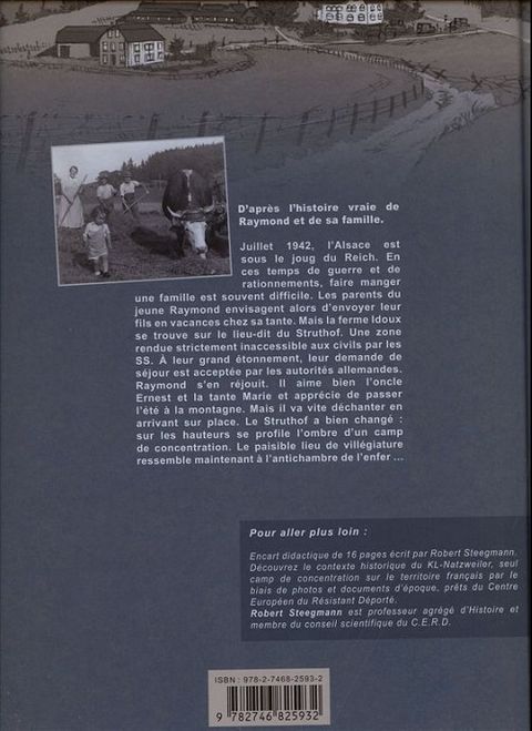 D'après l'histoire vraie de Raymond et de sa famille. Juillet 1942, l'Alsace est sous le joug du Reich. En ces temps de guerre et de rationnements, faire manger une famille est souvent difficile. Les parents du jeune Raymond envisagent alors d'envoyer leur fils en vacances chez sa tante. Mais la ferme Idoux se trouve sur le lieu-dit du Struthof. Une zone rendue strictement inaccessible aux civils par les SS. À leur grand étonnement, leur demande de séjour est acceptée par les autorités allemandes. Raymond s'en réjouit. Il aime bien l'oncle Ernest et la tante Marie et apprécie de passer l'été à la montagne. Mais il va vite déchanter en arrivant sur place. Le Struthof a bien changé : sur les hauteurs se profile l'ombre d'un camp de concentration. Le paisible lieu de villégiature ressemble maintenant à l'antichambre de l'enfer... Pour aller plus loin : encart didactique de 16 pages écrit par Robert Steegmann. Découvrez le contexte historique du KL-Natzweiler, seul camp de concentration sur le territoire français par le biais de photos et documents d'époque, prêts du Centre Européen du Résistant Déporté.