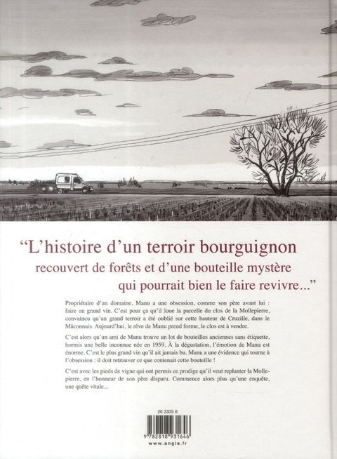 L'histoire d'un terroir bourguignon recouvert de forêts et d'une bouteille mystère qui pourrait bien le faire revivre... Propriétaire d'un domaine, Manu a une obsession, comme son père avant lui : faire un grand vin. C'est pour ça qu'il loue la parcelle du clos de la Molle Pierre, convaincu qu'un grand terroir a été oublié sur cette hauteur de Cruzille, dans le Mâconnais. Aujourd'hui, le rêve de Manu prend forme, le clos est à vendre. C'est alors qu'un ami de Manu trouve un lot de bouteilles anciennes sans étiquette, hormis une belle inconnue née en 1959. À la dégustation, l'émotion de Manu est énorme. C'est le plus grand vin qu'il ait jamais bu. Manu a une évidence qui vire à l'obsession : il doit retrouver ce qu'était cette bouteille ! C'est avec les pieds de vigne qui ont permis ce prodige qu'il veut replanter la Molle Pierre, en l'honneur de son père disparu. Commence alors plus qu'une enquête, une quête vitale...
