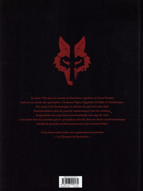 En mars 1763, dans la contrée de Racleterre, Apolline et Clovis Tricotin mettent au monde des quintuplés : Clodomir, Pépin, Dagobert, Clotilde et Charlemagne. Des cinq, c'est Charlemagne, le dernier « sorti », qui est le plus doué et le plus tenace. Il semble même qu'il ait un don pour communiquer avec les animaux. Mais alors que leur père succombe de la rage, la fratrie est frappée par le destin. La vie des quintuplés est brisée alors qu'ils se retrouvent dispersés...