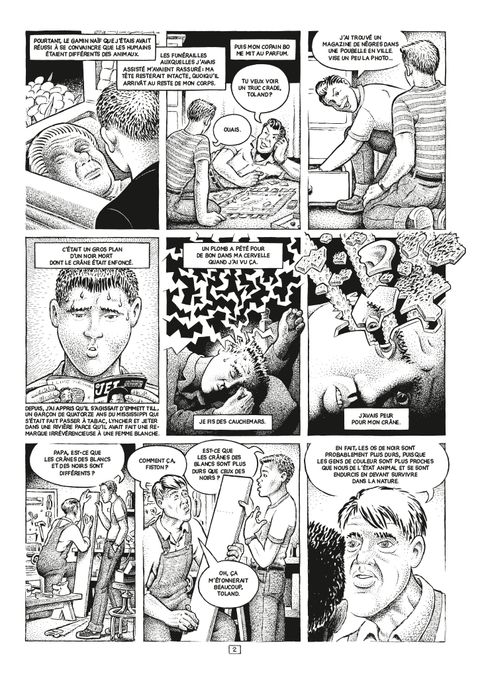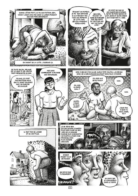 L'amérique est en train de changer. Mais pour toland polk, cela n'a guère d'importance. déjà plus adolescent mais pas encore adulte, toland doit affronter seul une différence que la société n'est pas prête à accepter en ce début des années soixante : celle de son homosexualité. la rencontre inattendue de ginger raines va pousser toland à sortir de sa coquille et lui faire découvrir une oppression bien plus violente que celle qu'il subit : celle des noirs dans un sud encore ségrégationniste. Engagé malgré lui dans la lutte pour les droits civiques, le jeune homme va devoir prendre ses responsabilités vis-à-vis des autres et de lui même. originaire du sud des etats-unis, howard cruse mêle fiction et incidents vécus dans ce récit dense oú se déploie tout un pan de la société américaine. le portrait qu'il brosse évite les simplifications manichéennes pour montrer une société en crise lorsque ses contradictions se heurtent à l'évolution des mentalités. Il décrit un sud oú les marginaux de tous bords se côtoient et oú la résistance à l'oppression des uns porte déjà en germe celle des autres. surtout, il crée en toland polk un héros complexe, attachant malgré ses défauts, qu'un parcours quasi initiatique va amener à découvrir la noirceur, la grandeur et la complexité du monde.