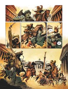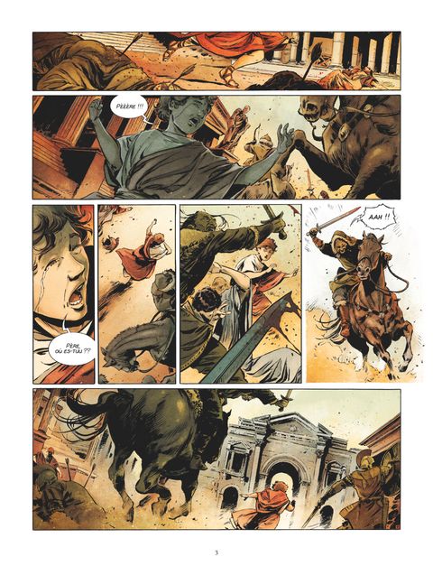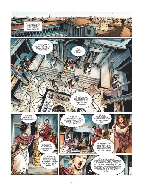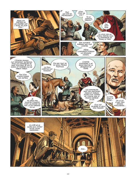 Le dernier rempart face aux invasions barbaresAu Ve siècle de notre ère, le pape Léon le Grand, qui règne fermement sur son troupeau alors que l'Empire romain se désagrège et s'effondre, est une figure centrale de la papauté. Imposant la tradition avec force et détermination, il contribue à structurer l'Église et impose le choix de Rome comme siège incontestable du Christianisme. Ses sermons, ses lettres, sont toujours aujourd'hui consultés et restent une référence. À ce titre, Léon est l'un des pères de l'Église. Mais plus encore, lorsque le peuple de Rome se retrouve désarmé devant l'avancée barbare, alors que l'Empereur est incompétent ou même a pris la fuite, Léon ira affronter tant Attila et sa horde de huns, que Genséric, le terrible chef vandale... L'empire s'effondrant, le pape reste le seul pouvoir auprès duquel les romains, terrifiés, cherchent refuge.