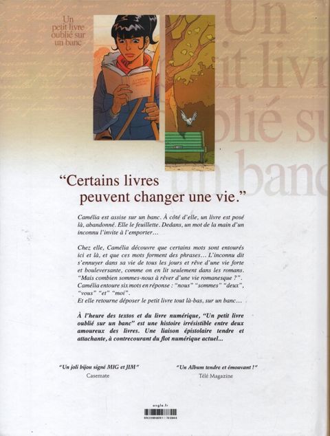 Camélia est assise sur un banc. À côté d'elle, un livre est posé là, abandonné. Elle le feuillète. Dedans, un mot de la main d'un inconnu l'invite à l'emporter...Chez elle, Camélia découvre que certains mots sont entourés ici et là, et que ces mots forment des phrases... L'inconnu dit s'ennuyer dans sa vie de tous les jours et rêve d'une vie amoureuse forte et bouleversante, comme on en lit seulement dans les romans. 'Mais combien sommes-nous à rêver d'une vie romanesque ?' Camélia entoure six mots en réponse : 'nous''sommes' 'deux', 'vous' 'et' 'moi'... Et elle retourne déposer le petit livre tout là-bas, sur un banc...À l'heure des textos et du livre numérique, 'Un petit livre oublié sur un banc' est une histoire pleine de charme entre deux amoureux des livres... Une liaison épistolaire tendre et attachante, à contrecourant du flot numérique actuel... Cette intégrale contient : - Tome 1 : Un Petit livre oublié sur un banc 1 - Tome 2 : Un Petit livre oublié sur un banc 2