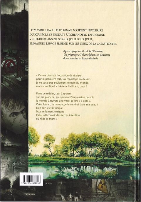26 avril 1986. À Tchernobyl, le coeur du réacteur de la centrale nucléaire commence à fondre.... Un nuage chargé de radionucléides parcourt des milliers de kilomètres. Sans que personne ne le sache. et ne s'en protège. C'est la plus grande catastrophe nucléaire du XXe siècle. Qui fera des dizaines de milliers de victimes. À cette époque, Emmanuel Lepage a 19 ans. Il regarde et écoute, incrédule, les informations à la télévision. 22 ans plus tard, en avril 2008, il se rend à Tchernobyl... Pour rendre compte, par le texte et le dessin, de la vie des survivants et de leurs enfants sur des terres hautement contaminées. Quand il décide de partir là-bas, à la demande de l'association les Dessin'acteurs, Emmanuel a le sentiment de défier la mort. Quand il se retrouve dans le train qui le mène en Ukraine, où est située l'ancienne centrale, une question taraude son esprit : que suis-je venir faire ici ?