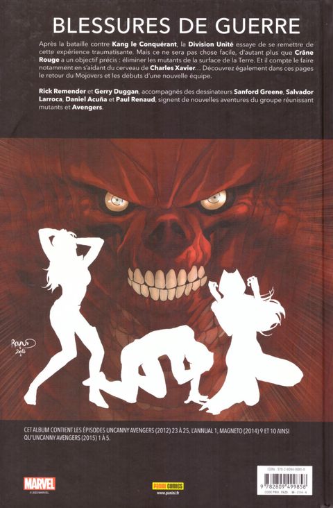 Quand Magnéto décide de retrouver le criminel Crâne Rouge, qui s'est approprié le cerveau de Charles Xavier, il commet un acte terrible qui va aboutir au retour d'Onslaught et à de gros changements chez les Uncanny Avengers. Mais ce n'est que le début de leurs soucis ! Il va ensuite leur falloir faire face à la menace du Maître de l'Evolution qui a des informations importantes pour Vif-Argent et la Sorcière Rouge ! Dernier tome consacré aux épisodes de Rick Remender sur la série (les derniers qu'il écrit pour Marvel), avec le prologue d'Axis et l'intégralité de la deuxième série. En plus, le premier Annual de la saga et deux épisodes empruntés à la série Magneto, en lien également avec Axis !