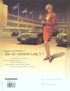Fille adoptive et principale collaboratrice de James Fitzroy, ambassadeur itinérant, envoyé spécial du secrétaire d'État américain en Europe, Suzan est une jeune femme intelligente et multilingue, épanouie et parfaitement heureuse auprès d'un père attentionné. Mais ce bonheur trop parfait cache bien des failles, bien des douleurs et bien des mystères. Rattrapée par son passé, Suzan n'aura désormais d'autre choix que de jouer le rôle le plus dangereux de sa vie, pourtant déjà riche en événements, celui de Lady S, espionne de haut vol dans les milieux diplomatiques. Plusieurs éditions avec même EAN/ISBN. L'EO est celle de DL 10/2004. A noter qu'il existe aussi un HC DL 10/2004 62 pages qui est noté tome 0 dans BDM : 1250 exemplaires HC - Comprend les 12 premières planches dans leur état final, les planches 13 à 28 encrées en noir et blanc, puis jusqu'à la planche 39 en crayonnés et accompagnées du script. Finalement, un dossier de 10 pages se trouve en fin d'album contenant une partie du storyboard, des recherches de personnages et une courte biographie des auteurs.