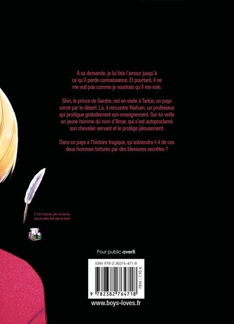 À sa demande, je lui fais l'amour jusqu'à ce qu'il perde connaissance. Et pourtant, il ne me voit pas comme je voudrais qu'il me voie.Shin, le prince de Garshe, est en visite à Tarkia, un pays cerné par le désert. Là, il rencontre Yashum, un professeur qui prodigue gratuitement son enseignement. Sur lui veille un jeune homme du nom d'Amar, qui s'est autoproclamé son chevalier servant et le protège jalousement. Dans ce pays à l'histoire tragique, qu'adviendra-t-il de ces deux hommes torturés par des blessures secrètes ?