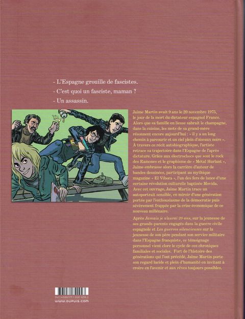 Jaime Martin avait 9 ans le 20 novembre 1975, le jour de la mort de Franco. Alors que sa famille en liesse sabrait le champagne, dans la cuisine, les mots de sa grand-mère résonnent encore aujourd'hui : "Il y a un long chemin à parcourir et un ciel plein d'oiseaux noirs". A travers ce récit autobiographique, l'artiste retrace sa trajectoire dans l'Espagne de l'après dictature en miroir d'une génération portée par l'enthousiasme de la démocratie et sévèrement frappée par la crise économique. Jaime s'en sort grâce au dessin, sa passion depuis l'enfance. Ado, sa carrière d'auteur de BD se décide quand il découvre le rock et Métal Hurlant. L'âge adulte vient ensuite creuser les distances avec son ancienne bande tandis que le système libéral fait des victimes chez ses vieux amis. Après "Jamais je n'aurai 20 ans", sur la jeunesse de ses grands-parents engagés dans la guerre civile espagnole et "Les guerres silencieuses" sur la jeunesse de son père pendant son service militaire dans l'Espagne franquiste, ce témoignage personnel vient clore le cycle de ces chroniques familiales et sociales. Fort de l'histoire des générations qui l'ont précédé, le dessinateur porte son regard lucide et plein d'humanité en invitant à croire en l'avenir et aux rêves toujours possibles.