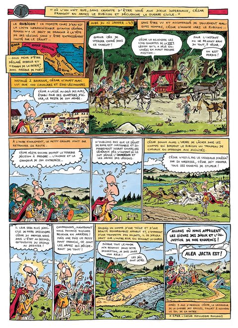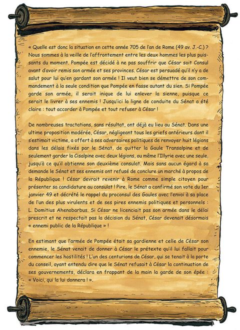 Nous sommes en 49 avant J. -C. La conquête des Gaules (58-51) a procuré à César le prestige, la richesse, et une armée incomparable. Mais le Sénat refuse les propositions modérées de César et ôte par décret ses pouvoirs à César, qui devra être traité en ennemi public, si, après un délai fixé, il n'a pas déposé les armes. Alors, en janvier 49, César passe le Rubicon, rivière qui sépare la Gaule Cisalpine du reste de l'Italie, et marche sur Rome avec ses légions. Alea Jacta Est! " Le sort en est jeté " ! C'est le début de la guerre civile et de la lutte contre Pompée le Grand, à qui le Sénat confie la défense de la République.