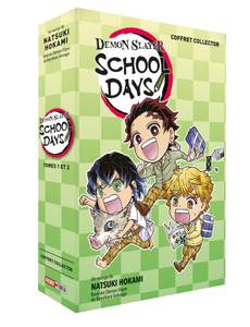 Finie la traque des démons pour Tanjirô, Nezuko, Inosuke, Zenitsu et tous les autres. Ici les personnages du best-seller Demon Slayer se transforment en élèves ou en professeurs. Et le moins que l'on puisse dire, c'est que Tanjiro & cie vivent bien des péripéties ! Dans un quotidien paisible, on n'est jamais à l'abri d'aventures loufoques ! Découvrez dans ce coffret, un spin-off hilarant regroupant les deux premiers tomes et un ex-libris. Après avoir conquis tant de lecteurs avec Demon Slayer, la série de Koyoharu Gotouge se tourne maintenant vers l'humour. Demon Slayer School Days, dessiné par Natsuki Hokami, est le manga dérivé du court anime parodique du même nom. Cette fois, il n'est pas question pour nos pourfendeurs de se lancer dans des confrontations grandioses face à d'impressionnants démons. Tanjirô et ses amis rejoignent les bancs de l'école en tant qu'étudiants. Une nouvelle facette où l'action laisse place aux fous rires. Un spin-off toujours en cours au Japon et qui devrait autant plaire aux fans de la licence qu'à ceux désirant une aventure particulièrement drôle
