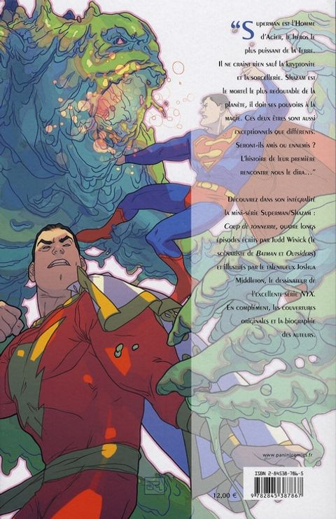 " Superman est l'Homme d'Acier, le héros le plus puissant de la terre. Il ne craint rien sauf la kryptonite et la sorcellerie. Shazam est le mortel le plus redoutable de la planète, il doit ses pouvoirs à la magie. Ces deux êtres sont aussi exceptionnels que différents. Seront-ils amis ou ennemis ? L'histoire de leur première rencontre nous le dira... " Découvrez dans son intégralité la mini-série Superman/Shazam : Coup de tonnerre, quatre longs épisodes écrits par Judd Winick (le scénariste de Batman et Outsiders) et illustrés par le talentueux Joshua Middleton, le dessinateur de l'excellente série NYX. En complément, les couvertures originales et la biographie des auteurs.
