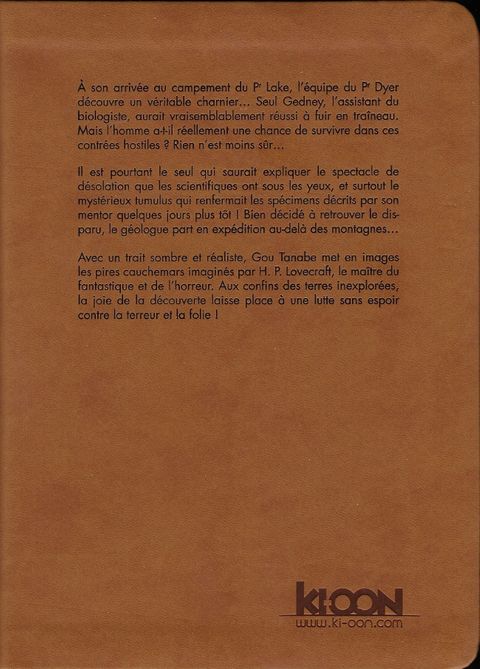En 1931, une expédition de sauvetage découvre le campement en ruines du Pr Lake, parti explorer l'Antarctique quelques mois plus tôt. Son équipe de scientifiques avait envoyé un message annonçant une découverte extraordinaire avant de sombrer dans le silence... Sur place, des squelettes humains dépouillés de leur chair laissent imaginer les scènes d'horreur qui ont pu se dérouler. Plus perturbantes encore : les immenses montagnes noires aux pics acérés au pied desquelles le Pr Lake et ses compagnons ont rendu l'âme... Ces terres désolées semblent cacher de terribles secrets. Gare aux imprudents qui oseraient s'y aventurer ! Avec un trait sombre et réaliste, Gou Tanabe met en images les pires cauchemars imaginés par H. P. Lovecraft, le maître du fantastique et de l'horreur. Aux confins des terres inexplorées, la joie de la découverte laisse place à une lutte sans espoir contre la terreur et la folie !