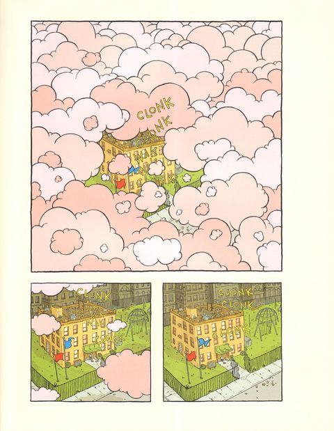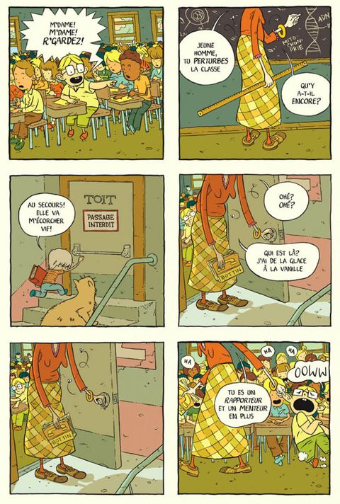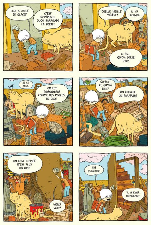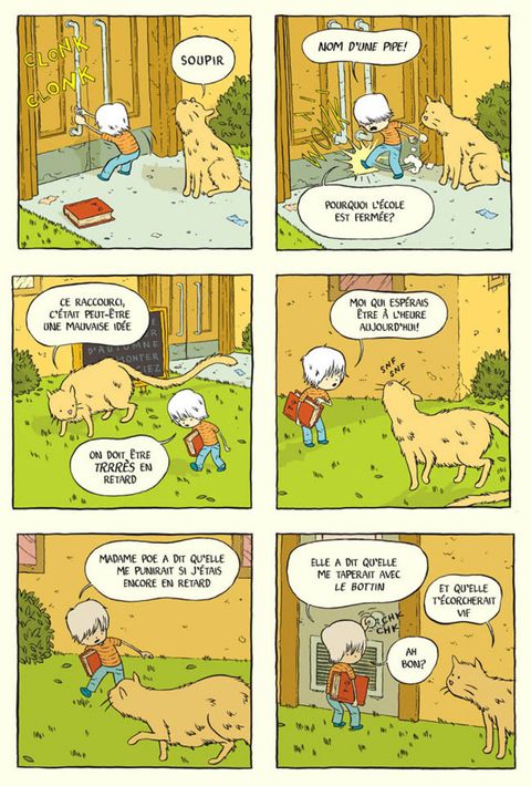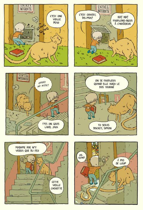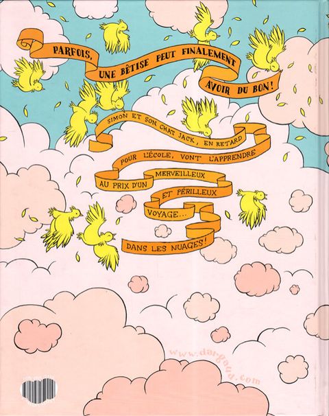 À la demande générale, un nouvel album estampillé "jeunesse". Par un vrai grand talent américain, le fantaisiste et merveilleux voyage d'un enfant et son chat cherchant par tous les moyens à rejoindre leur classe ! Simon et son chat Jack sont devant leur école, encore une fois en retard ! Ne pouvant entrer discrètement en classe, les deux compères se réfugient sur le toit, et leur journée se transforme alors en un incroyable voyage ! Les deux amis empruntent un mystérieux escalier qui mène aux nuages, se font un copain d'un nuage triste, se battent contre un orage puis une foule d'oiseaux pour une équipée fantastique à la fin heureuse...