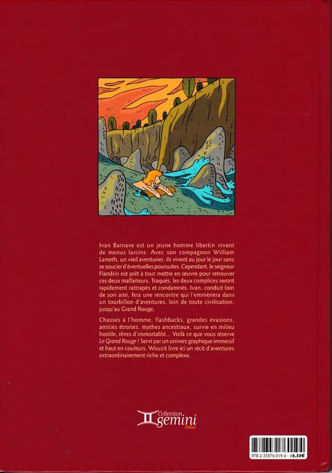 Ivan Barnave est un jeune homme libertin vivant de menus larcins. Avec son compagnon William Lameth, un vieil aventurier, ils vivent au jour le jour sans se soucier d'éventuelles poursuites. Cependant le seigneur Flandrin, pour qui un denier est un denier, est prêt à tout mettre en oeuvre pour retrouver ces deux malfaiteurs.Traqués, les deux complices seront rapidement rattrapés et condamnés. Ivan, conduit loin de son ami, fera une rencontre qui l'emmènera dans un tourbillon d'aventures, loin de toute civilisation, jusqu'au Grand Rouge. Chasses à l'homme, fl ashbacks, grandes évasions, amitiés étroites, mythes ancestraux, survie en milieu hostile, rêves d'immortalité. Voilà ce que vous réserve Le Grand Rouge ! Servi par un univers graphique immersif et haut en couleurs, Wouzit livre ici un récit d'aventure extraordinairement riche et complexe.