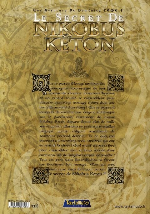 que se passe-t-il lorsqu'un nain des montagnes, accompagné de son inséparable chouette, lorsqu'un cheyenne et un renard érudit se rassemblent pour discuter d'un vieux message trouvé dans une bouteille au fond d'un étang ? que se passe-t-il lorsqu'ils découvrent une énigme alchimique sur le parchemin, testament du moine nilkobus kéron, disparu depuis plus de mille ans, et qui fait allusion à un précieux médaillon magique, qu'une vulgaire marchande de souvenirs prétend détenir. et en quoi ceci intéresse-t-il vivement trois sorcières qui ont eu vent de la chose ? quel motif est assez fort pour rassembler tout ce beau monde dans l'immense ville de dingobar un jour de marché ? tous ces gens aussi dissemblables ne feront pas forcément bon ménage. mais qui sera assez rusé; assez fort pour percer le secret de nikobus kéron ?!.