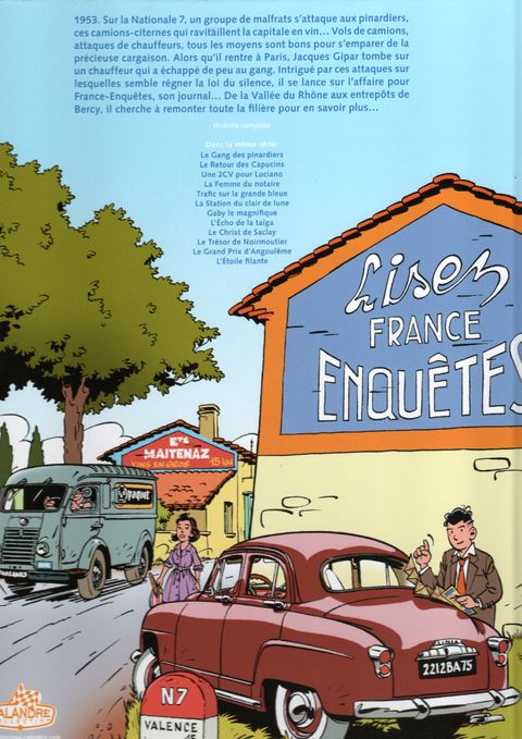 1953. Sur la Nationale 7, un groupe de malfrats s'attaque aux pinardiers, ces camions citernes qui ravitaillent la capitale en vin. Vol de camions, attaque de chauffeurs, tous les moyens sont bons pour s'emparer de la précieuse cargaison. Alors qu'il rentre sur Paris, Jacques Gipar tombe sur un chauffeur qui a échappé de peu au gang. Intrigué par ces attaques sur lesquelles semble régner la loi du silence, il se lance sur l'affaire pour France-Enquêtes, son journal. De la vallée du Rhône aux entrepôts de Bercy, il cherche à remonter toute la filière pour en savoir plus.