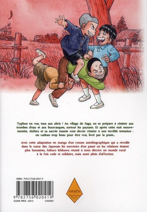 Typhon en vue, tous aux abris ! Au village de Saga, on se prépare à résister aux trombes d'eau et aux bourrasques, surtout les paysans. Et après cette nuit mouvementée, Akihiro et sa sacrée mamie vont devoir résister à une terrible tentation : un cadeau trop beau pour être vrai, livré par la poste. Avec cette adaptation en manga d'un roman autobiographique qui a réveillé dans le coeur des Japonais les souvenirs d'un passé où les relations étaient plus humaines, Saburo Ishikawa réussit à nous décrire un monde rural à la fois rude et solidaire, mais aussi plein d'affection.