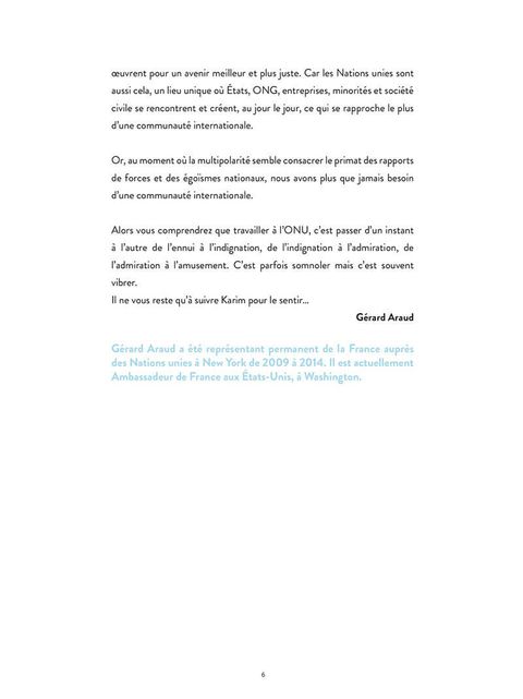 Sous la forme de brèves histoires Karim Lebhour raconte sans jugement mais avec simplicité et beaucoup d'humour la complexité de la diplomatie multilatérale Onusienne qu'il a pu observer en tant que correspondant de presse durant 4 ans. La sobriété du dessin en noir/blanc/bleu d'Aude Massot sert très efficacement le récit, (...) Voir le commentaire