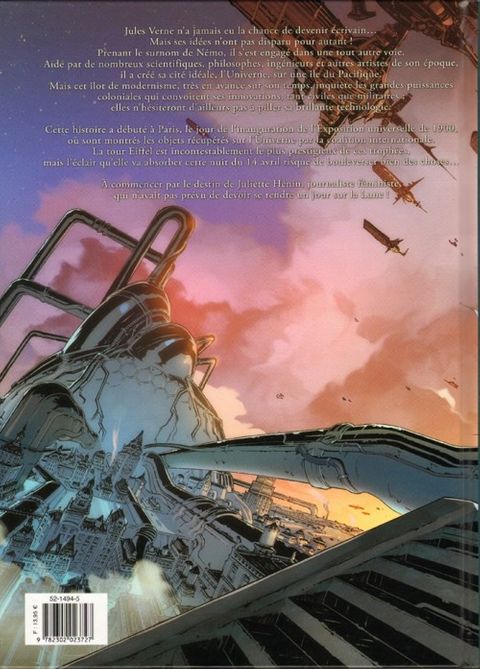 Univerne : une uchronie steampunk qui décrit le monde tel que Jules Verne l'a imaginé à travers son oeuvre ! Un cocktail explosif qui mélange personnages réels, personnages imaginés par le romancier et d'autres de la culture littéraire de cette époque. Jules Verne n'a jamais eu la chance de devenir écrivain. Mais ses idées n'ont pas disparu pour autant ! Prenant le surnom de Némo, il s'est donc engagé tout entier dans une autre voie. Aidé par de nombreux scientifiques, philosophes, ingénieurs et autres artistes de son époque, il a créé sa cité idéale, l'Univerne, sur une île du Pacifique. Mais cet îlot de modernisme, très en avance sur son temps, inquiète les grandes puissances coloniales, qui convoitent ses innovations, tant civiles que militaires ; elles n'hésiteront d'ailleurs pas à piller sa brillante technologie. Cette histoire a débuté à Paris, le jour de l'inauguration de l'exposition Universelle de 1900, où sont montrés les objets récupérés sur l'Univerne par la coalition internationale. La tour Eiffel est incontestablement le plus prestigieux de ces trophées, mais l'éclair qu'elle va absorber cette nuit du 14 avril risque de bouleverser bien des choses... À commencer par le destin de Juliette Hénin, journaliste féministe, qui n'avait pas prévu de devoir se rendre un jour sur la Lune !