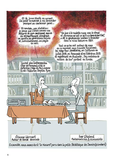 Février 2020, Etienne Lécroart fait un rêve étrange et effrayant qui lui fait prendre conscience de ses craintes quant au réchauffement climatique : les générations futures sont véritablement en danger ! Il s'en ouvre à son ami Ivar Ekeland, mathématicien, économiste et philosophe qui s'intéresse de près à cette question. En faisant intervenir des spécialistes de diverses disciplines et des acteurs de terrain, ils font le point sur la situation actuelle et montrent que l'avenir reste ouvert : les moyens d'action sont là ; encore faut-il avoir le courage de s'en servir !