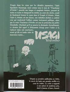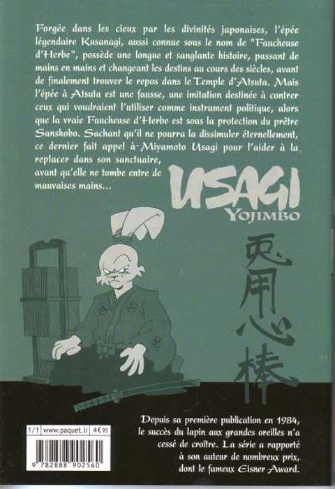 Forgée dans les cieux par les divinités japonaises, l'épée légendaire kusanagi, aussi connue sous le nom de "faucheuse d'herbe", possède une longue et sanglante histoire, passant de mains en mains et changeant les destins au cours des siècles, avant de finalement trouver le repos dans le temple d'atsuta. Mais l'épée à atsuta est une fausse, une imitation destinée à contrer ceux qui voudraient l'utiliser comme instrument politique, alors que la vraie faucheuse d'herbe est sous la protection du prêtre sanshobo. sachant qu'il ne pourra la dissimuler éternellement, ce dernier fait appel à miyamoto usagi pour l'aider à la replacer dans son sanctuaire, avant qu'elle ne tombe entre de mauvaises mains.