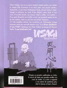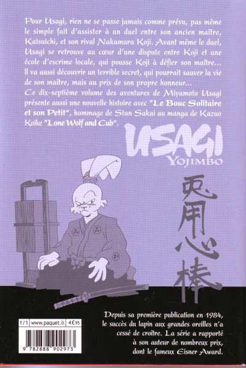 Pour Usagi, rien ne se passe jamais comme prévu, pas même le simple fait d'assister à un duel entre son ancien maître, Katsuichi, et son rival Nakamura Koji. Avant même le duel, Usagi se retrouve au coeur d'une dispute entre Koji et une école d'escrime locale, qui pousse Koji à défier son maître... ll va aussi découvrir un terrible secret, qui pourrait sauver la vie de son maître, mais au prix de son propre honneur... Ce dix-septième volume des aventures de Miyamoto Usagi présente aussi une nouvelle histoire avec »Le Bouc Solitaire et son Petit«, hommage de Stan Sakai au manga de Kazuo Koike »Lone Wolf and Cub«.
