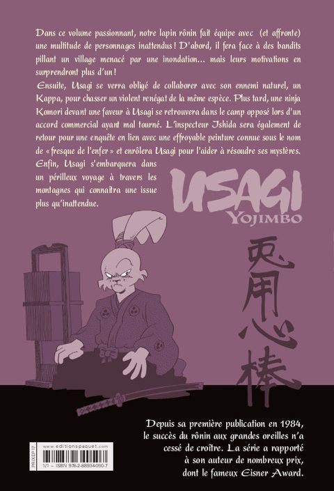Dans ce nouveau volume, notre lapin ronin rencontre une multitude de personnages inattendus : des bandits déchus, un kappa renégat, et un ninja komori ! Sans oublir l'inspecteur Ishida qui mène l'enquête sur une peinture épouvantable, connue sous le nom de la toile de l'Enfer !