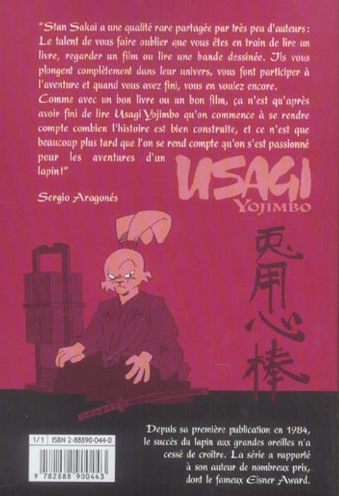 « Stan Sakai a une qualité rare partagée par très peu d'auteurs : Le talent de vous faire oublier que vous êtes en train de lire un livre, regarder un film ou lire une bande dessinée. Ils vous plongent complètement dans leur univers, vous font participer à l'aventure et quand vous avez fini, vous en voulez encore. Comme avec un bon livre ou un bon film, ça n'est qu'après avoir fini de lire Usagi Yojimbo qu'on commence à se rendre compte combien l'histoire est bien construite, et ce n'est que beaucoup plus tard que l'on se rend compte qu'on s'est passionné pour les aventures d'un lapin ! » Sergio Aragonés