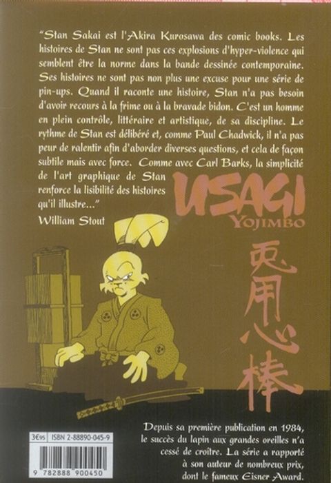 " Stan Sakai est l'Akira Kurosawa des comic books. Les histoires de Stan ne sont pas ces explosions d'hyper-violence qui semblent être la norme dans la bande dessinée contemporaine. Ses histoires ne sont pas non plus une excuse pour une série de pin-ups. Quand il raconte une histoire, Stan n'a pas besoin d'avoir recours à la frime ou à la bravade bidon. C'est un homme en plein contrôle, littéraire et artistique, de sa discipline. Le rythme de Stan délibéré et, comme Paul Chadwick, il n'a pas peur de ralentir afin d'aborder diverses questions, et cela de façon subtile mais avec force. Comme avec Carl Barks, la simplicité de l'art graphique de Stan renforce la lisibilité des histoires qu'il illustre... " William Stout. Depuis sa première publication en 1984, le succès du lapin aux grandes oreilles n'a cessé de croître. La série a rapporté àson auteur de nombreux prix, dont le fameux Eisner Award.
