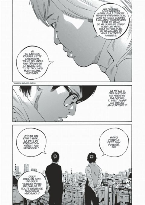 Sur les pas d'Ushijima, un 'encaisseur' qui travaille pour le compte des yakuzas, le lecteur rencontrera une série de personnages tombés dans la déchéance du surendettement. Au travers de ces destinées toutes plus tragiques les unes que les autres, c'est un portrait original de la 'société d'en bas' que l'on découvre dans ce manga avec, par exemple, une jeune fille ne résistant pas à la pression sociale et se ruinant en vêtements de luxe ou un joueur invétéré et obsessionnel qui y laisse sa chemise et même plus, etc. Ushijima, l'usurier de l'ombre est un manga vraiment étonnant ! On rentre dans un univers très noir où les yakuzas règnent en maîtres, où blanchiment d'argent et combines en tout genre fleurissent dans un univers urbain décalé.