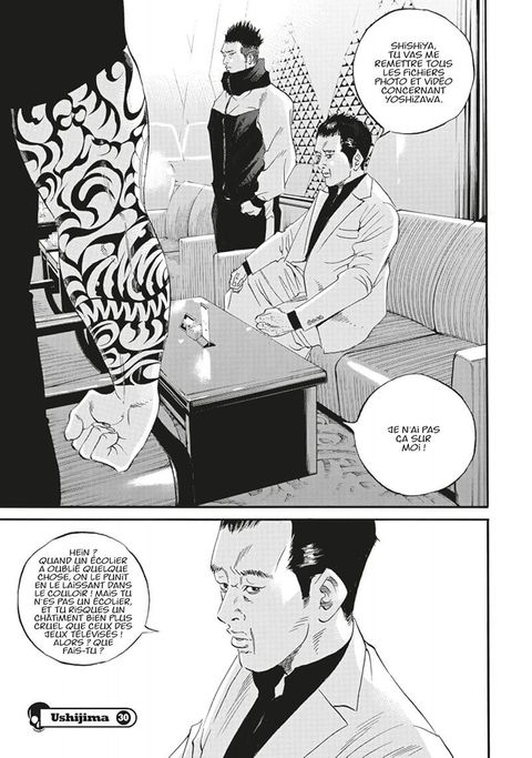 Sur les pas d'Ushijima, un "encaisseur" qui travaille pour le compte des yakuzas, le lecteur rencontrera une série de personnages tombés dans la déchéance du surendettement. Au travers de ces destinées toutes plus tragiques les unes que les autres, c'est un portrait original de la "société d'en bas" que l'on découvre dans ce manga avec, par exemple, une jeune fille ne résistant pas à la pression sociale et se ruinant en vêtements de luxe ou un joueur invétéré et obsessionnel qui y laisse sa chemise et même plus, etc. Ushijima, l'usurier de l'ombre est un manga vraiment étonnant ! On rentre dans un univers très noir où les yakuzas règnent en maîtres, où blanchiment d'argent et combines en tout genre fleurissent dans un univers urbain décalé. Shohei Manabe fait partie des auteurs les plus prometteurs de la jeune génération de mangakas. Son style reconnaissable entre tous, avec un trait incisif, chargé d'encre est fascinant. Le style que ce soit du dessin ou des histoires présente un curieux mélange entre expressionnisme et western. La facilité de Shohei Manabe à restituer sa fascination pour la violence et la noirceur de l'âme humaine sans se perdre dans le propos en fait un des grands auteurs de roman noir graphique.